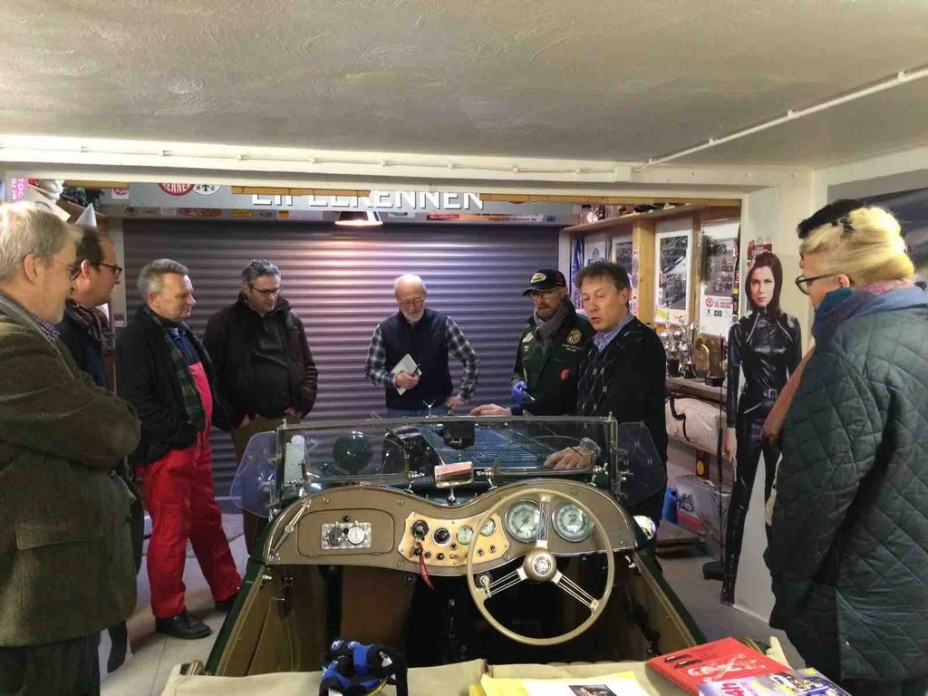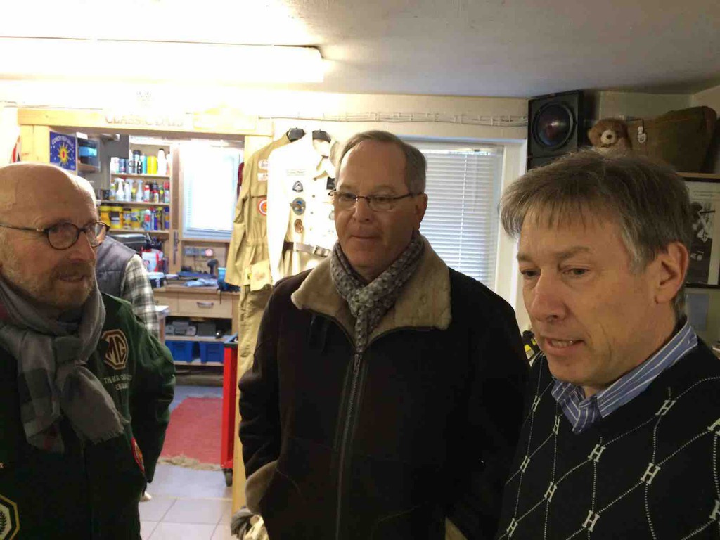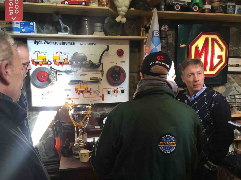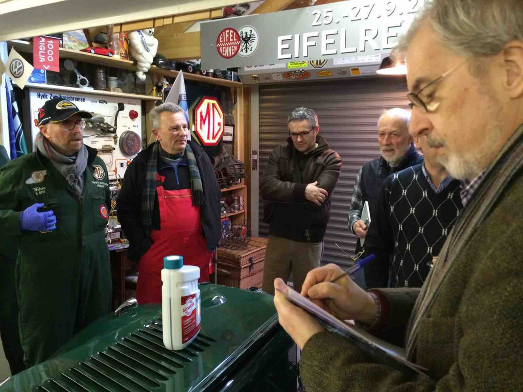 Unser Garagenworkshop Anfang des Jahrs hat schon Tradition. So kam es auch, dass wir schon nach kurzer Zeit wieder ausgebucht waren. Walter Kallenberg, Ritter und KFZ-Meister, war auch in diesem Jahr, zusammen mit dem allerersten Vorsitzenden, der Referent am MG TD der als Anschauungs- und Übungsobjekt diente. Jeder durfte und musste mal ran und zeigen was er oder sie gelernt hatten. Fragen gab es reichlich und es wurde noch mehr mitgeschrieben. Nach einer ausgiebigen und stärkenden Mittagspause eröffnete unser Haus- und Hofschneider, Harald Firmenich, seine Präsentation und Vorführung in der Orangerie von Hösel-Manor. Ein guter Tweed und ein gut sitzender Anzug sind halt unabdingbar. Besonders gefreut haben wir uns über den Besuch von Peter Meyer, dem Vorsitzenden des ADAC Nordrhein, in der ritterlichen Garage. Schade nur, dass der Besuch nur kurz sein konnte. Nach der Schneiderei ging's dann wieder zurück in die Remise und ans Werkzeug. Jetzt hieß es auch mal unters Auto zu sehen und zu fassen. Räder tauschen wurde geübt und was man denn wo und wie und wieviel ein- und nachzufüllen hat. Bremsen erklärte Walter am Modell. Zu guter Letzt dann, und das ist ganz wichtig, wurde erörtert was denn in den Kofferraum gehört? Wir werden dazu auf allgemeinen Wunsch hin, einen Werkzeugsatz auflegen, wo alle diese nützlichen Dinge drin zu finden sind. Abends dann ging es noch in einen benachbarten Landgasthof, wo der Tag seinen Ausklang fand. Der nächste Workshop ist auch schon in Planung.