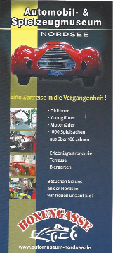Also wenn man denn schon mal in Ostfriesland ist, sein Krabbenbrötchen verspeist und noch Zeit bis zur Fähre ist, sollte man sich schon einen Besuch in diesem Kuriositätenkabinett gönnen. In einer Stunde ist man gut durch. Ein riesige Ansammlung von Autos, seltene und weniger seltene, Reklameschildern, Motorsport, Motorräder und jede Menge Krimskrams rund um alles was fährt und natürlich schwimmt. Einen kleinen Laden in einer Ecke gibt es auch, hier kann man stöbern und vielleicht das eine oder andere Mitbringsel zum Thema finden und erwerben. Also dann!