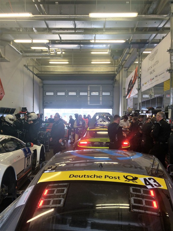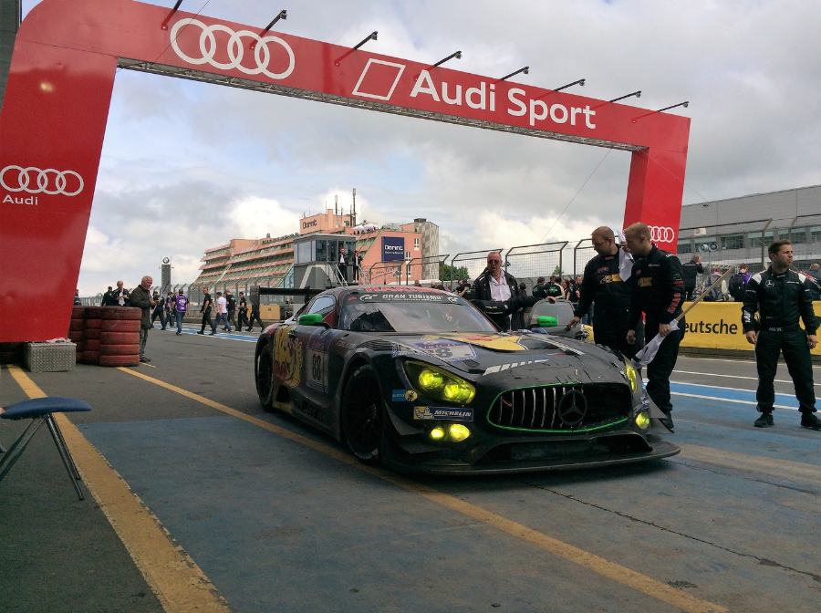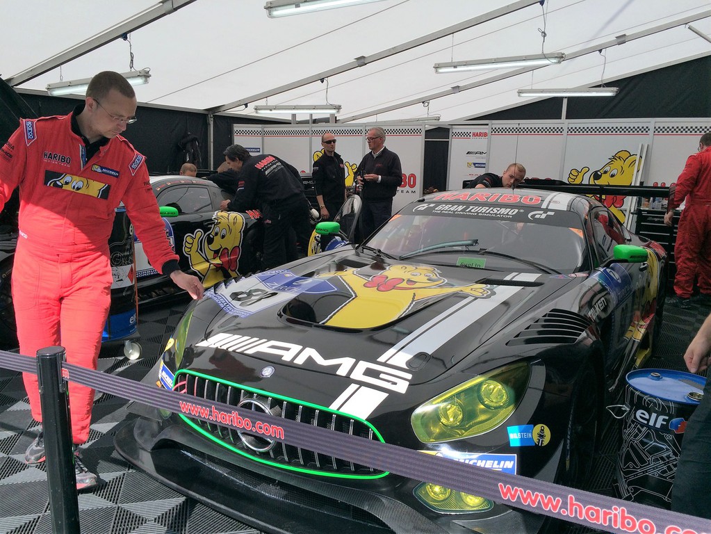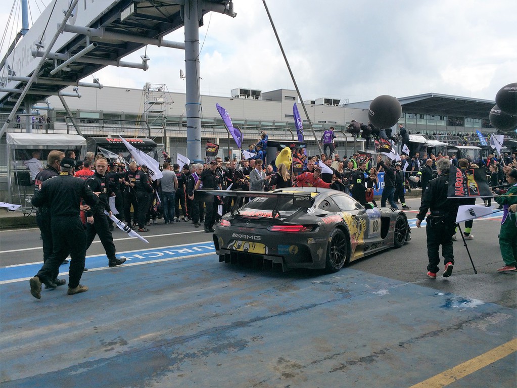 Zum Zieleinlauf findet man sich dann wieder in der Boxengasse ein, um die „Siegesfeieratmosphäre“ mitzuerleben. Dieses Jahr bildeten die 3 Siegerfahrzeuge, bestehend aus den 3 Mercedes AMG GT3 der Teams Black Falcon, HTP und Haribo, ein homogenes Bild auf der Siegertribüne für die Fahrzeuge.