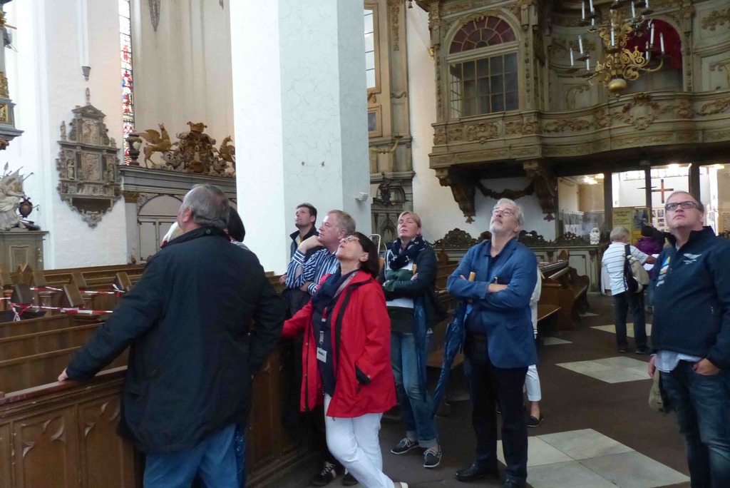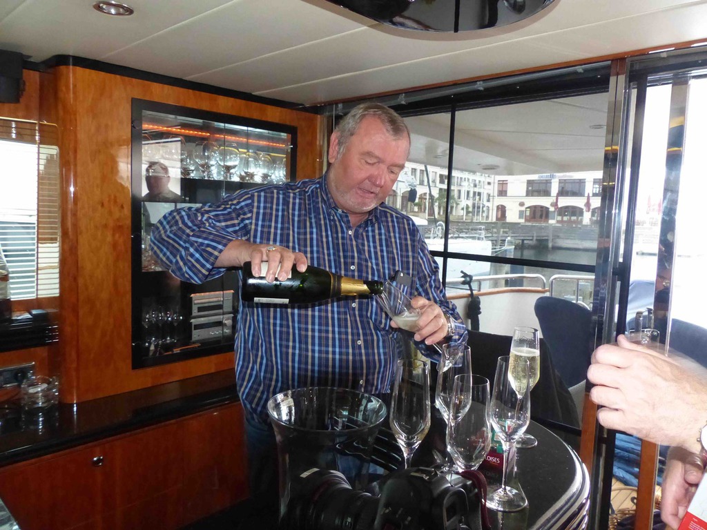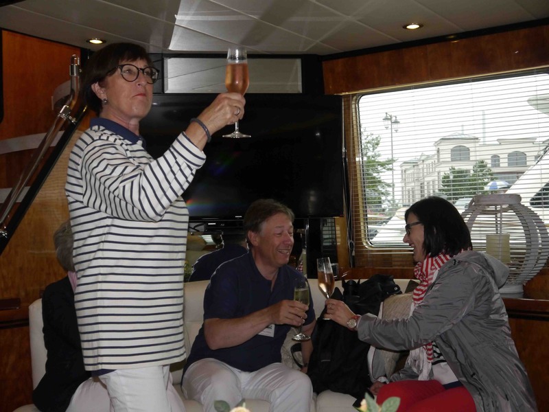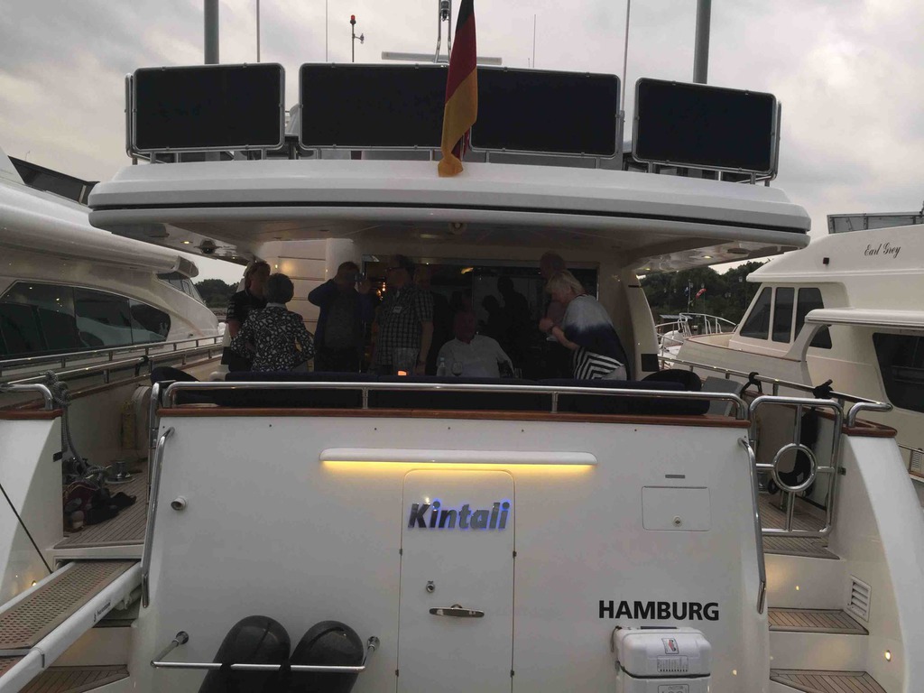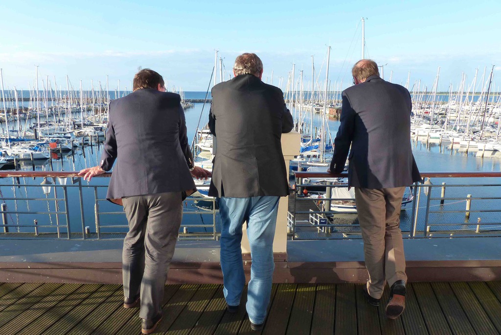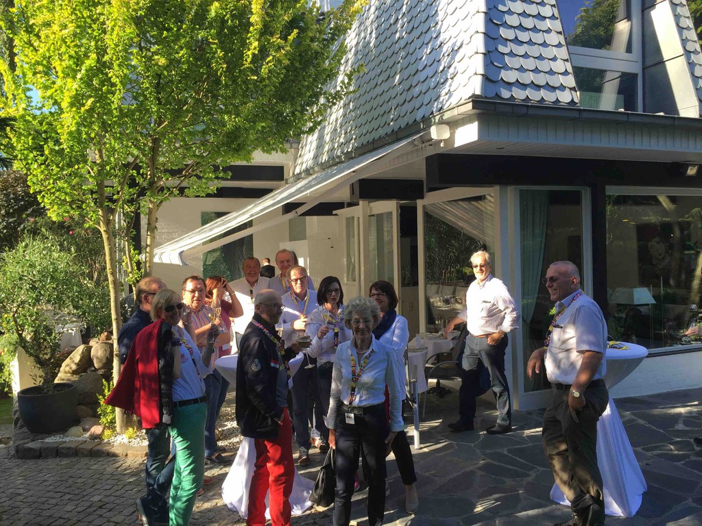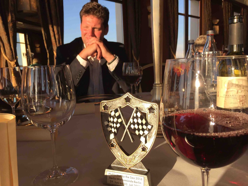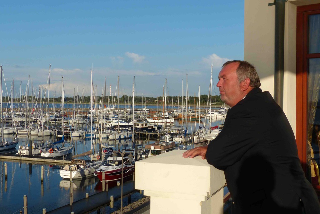 Samstagmorgen nach einem ausgezeichneten Frühstück gings dann aufs Schiff. Es schüttet schon wieder und reichlich Wind ist auch. Also leider nix mit Ostsee cruisen. Champagner hilft immer, man sitzt entspannt und bester Laune auf dem Schiff und plaudert und zählt die Schiffe. Schnell ist ein Alternativprogramm auf die vielen Füße gestellt und wir bekommen eine exklusive Stadtführung in Rostock. Eine tolle und sehenswerte Stadt. Danach noch mal wieder aufs Schiff und einen Imbiss genießen. Wie immer am letzten Tag lockt ein Galadinner die Teilnehmer. Standesgemäß und in vollem Ornat haben wir den legendären Salon Sonne in der Hohen Düne ganz für uns. Jetzt scheint die Sonne, und wie!! Auf dem Balkon bei ordentlich Wind von vorn den Sonnenuntergang genießen und die passierenden Kreuzfahrtschiffe bewundern. Ganz hervorragende Küche verwöhnt uns nach dem traditionellen Sektempfang. Ein überaus gelungener Abschluss dieser ersten erfolgreichen Veranstaltung der Ritter in diesem Jahr.