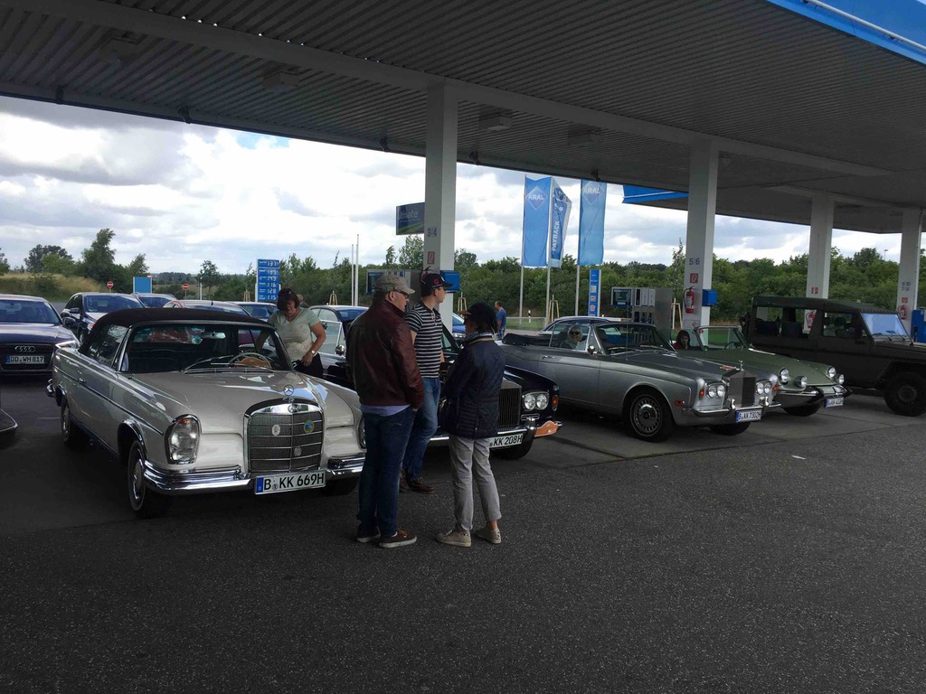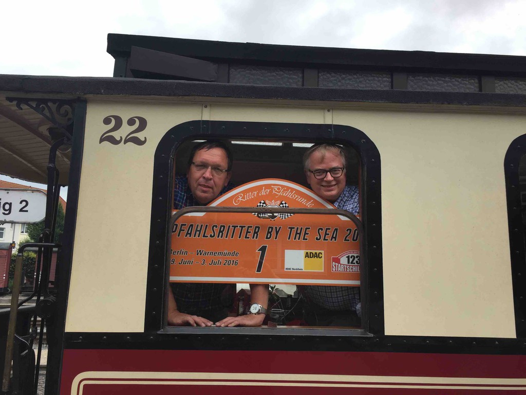 Mit hervorragenden Kaleschen aus der beeindruckenden Sammlung ausgestattet begaben wir uns auf den Prolog ins Brandenburgische bis zum Gut Borsig. So konnten die Teilnehmer sich mit den Fahrzeugen vertraut machen und die ersten Kilometer bei bestem Sonnenschein machen. Abends dann Chateau Kraus, zum Big Daddy Barbecue. Da kann man nur noch Danke sagen ob dieser grandiosen Party. Der Limousinen Service war geordert und so kamen die Teilnehmer wohlbehalten ins sehr gute und schöne Hotel in Spandau. Anderen Tags dann erst mal zum Volltanken, ein ganz beliebter Zwischenstopp auf dieser Tour. Auf nach Brandenburg auf wunderbaren Nebenstraßen und unter schattigen Alleen zum ersten Zwischenziel. Die Lunchpakete für den Tag sind immer eine gute Ergänzung bei langen Trips. Panzerfahren steht auf dem Programm. Also auf zur Panzerfahrschule, die Overalls an und los. Ein staubiges Erlebnis der Sonderklasse, da weiß man dann erst mal was denn große Autos sind. Übernachten in Neustrelitz und nach dem Abendessen das Dudelsackkonzert unseres Ritters Peter-Paul genießen. Am nächsten Tag auf nach Bad Doberan. Die Molli wartet. Mit der berühmten Bäderbahn gings dann im eigens für die Ritter reservierten Salonwagen bis nach Kühlungsborn und zurück. Catering im Zug bei gutem Wetter, was will man mehr. Nach der genüsslichen Fahrt unter Dampf auf zur letzten Etappe, auf nach Warnemünde zur Hohen Düne. Es nieselt, nein es schüttet! Sensationelles Hotel, tolles Ziel. Einchecken und genießen, freier Abend. Man konnte mit der Fähre rüber nach Warnemünde oder ganz einfach den wunderbaren Wellnessbereich des Hotels genießen.