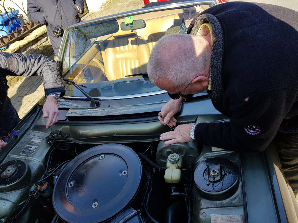 Unter der kulinarischen Aufsicht und Zubereitung unserer First Lady Siegi und der Assistenz von Burgfräulein Hilde wurde pünktlich um 10 Uhr vom Ritter Franz eine Tour d‘ Horizon durch die Oldtimerei begonnen. Was gehört in jeden Kofferraum, wie sieht eine gut gepackte Werkzeugtasche aus, die über die größten Unbillen des Liegenbleibens hinweghilft. Zündkerzen, Bremsen, Reifen, es gab nichts (und ich glaube, es gibt auch nichts), worauf der Allererste keine Antwort wüsste. Chapeau, Franz. Nach einem herzhaften Mittagessen mit Leberkäs, Kartoffelsalat nach Hausfrauenart und Bier und anschließendem Kaffee und Kuchen ging es dann zu den mitgebrachten Kaleschen, bei denen zu spezifischen Fragen der angereisten Ritter Stellung genommen wurde. Hier und da wurde auch mal eine Motorhaube von vielen helfenden Händen gerichtet – nicht hingerichtet. Abgerundet wurde die Veranstaltung durch einen Vortrag von Burgfräulein Ulrike, die uns den Weg zum einem erstklassig gepflegten Oldtimer aufzeigte, und zu dem Ritter Manfred seine legendären Produkte vorführte. Bei seiner Eigenentwicklung Power-Sand hat auch Öl in den Fugen der Bodenkacheln keine Chance mehr.