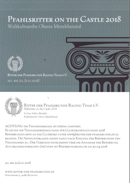 In diesem Jahr führt uns unsere Sommer- Rallye ans obere Mittelrheintal zu unserem Burgfräulein Ulli und Ritter Georg. Bitte denkt daran, frühzeitig eure Nennungen einzureichen. Es wird - wie immer- grandios.