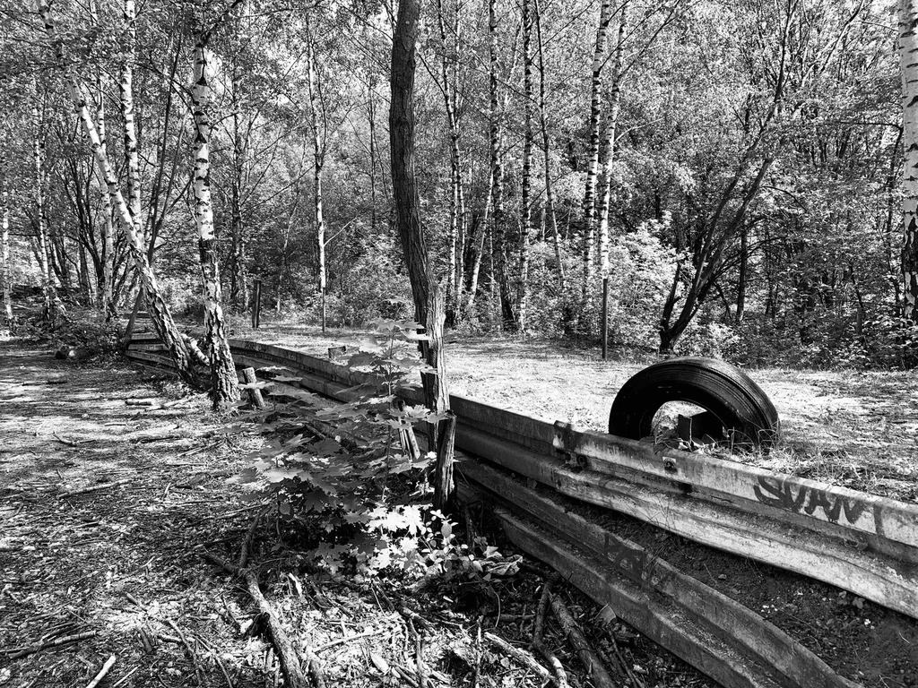 Gut, den Nürburgring kennt ja nun jedermann, Hockenheim und Zolder auch, aber den Almaring? Der war und ist noch immer mitten in Gelsenkirchen. Auf dem Gelände stilgelegten Kokerei Alma in Ückendorf entstand in den sechziger Jahren auf private Initiative einiger Enthusiasten ein Rundkurs mit etwa 1 km Streckenlänge. Initiator war die RAG, also nicht die RAG die wir kennen, sondern die Rheinländische Altwagen Gemeinschaft des Anton Brenner. Bis in die Achtziger wurden hier an den Almastraße Autorennen gefahren, übrigens nahezu Off-Limits bis die Anwohnerschaft dem Treiben ein Ende bereitete. Bei Google Earth ist der Kurs sogar noch zu erkennen. Zudem galt und gilt das Gelände durch Kokerei Rückstände als belastet. Heute ist das Gelände eine frei zugängige Parkanlage neben der Kleingartengemeinschaft. Ein lohnender Spaziergang am Wochenende denn die gesamte Stecke, die Markierungen die Leitplanken und die Start- und Ziellinie sind noch da. Ein bizarrer Lost-Place. Übrigens gleich vorn in der Garage neben der alten Einfahrt zum Gelände steht noch ein Opel Admiral A.
