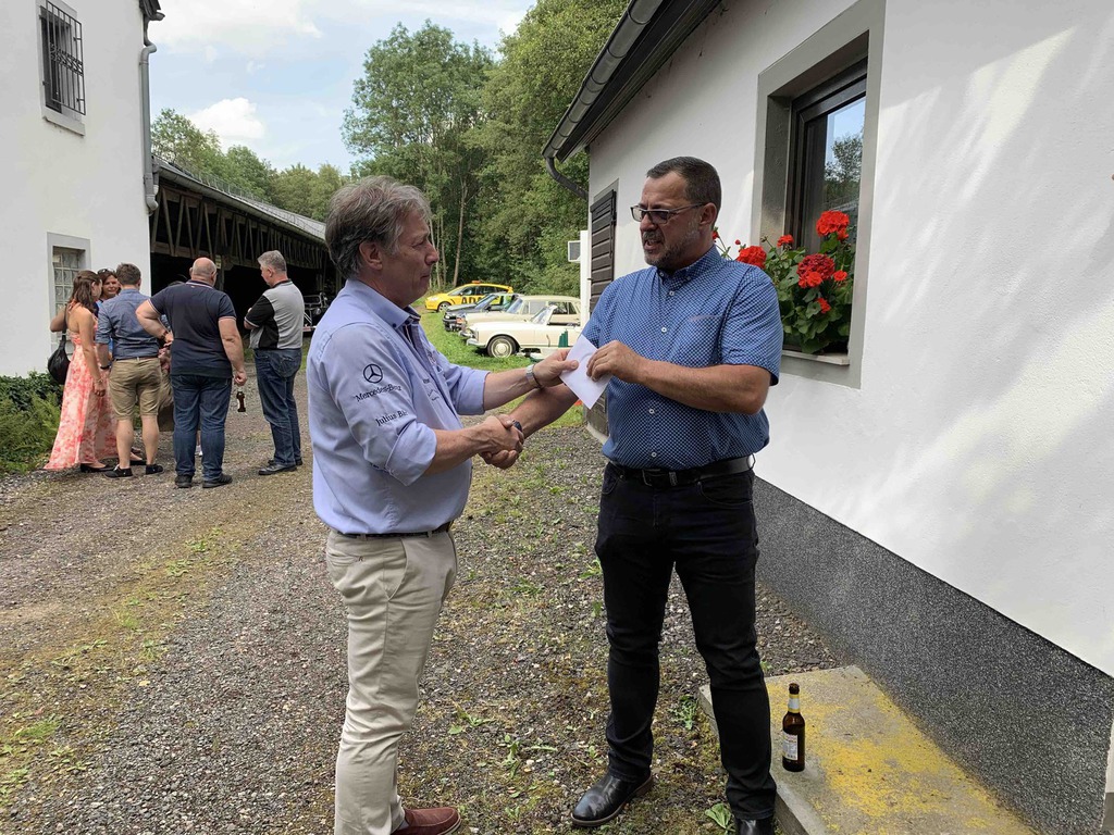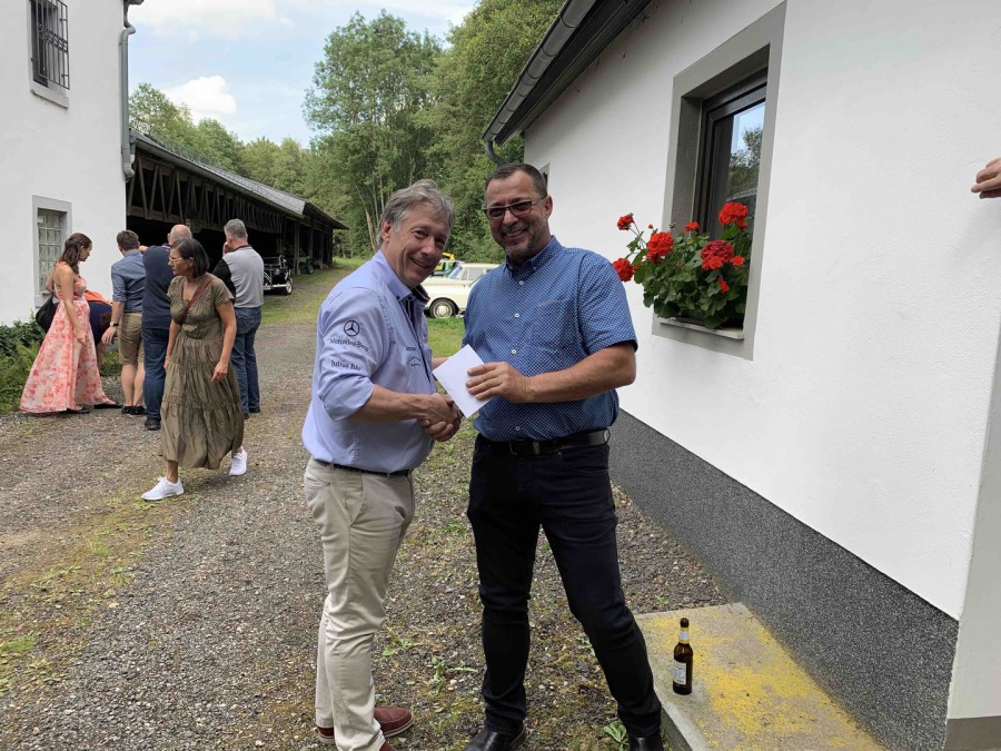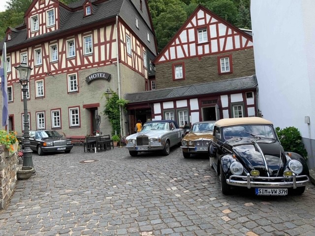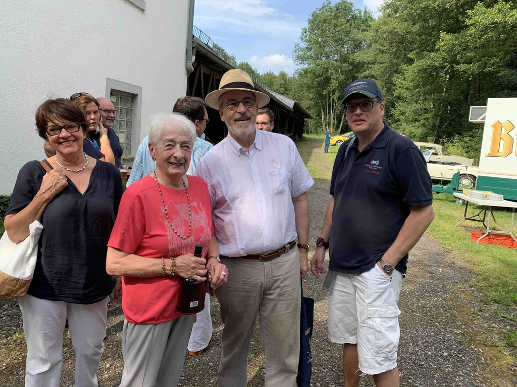 Wegen Corona war das dieses Jahr ja nix mit Springtime Run, aber die Ritter und Lieblichkeiten und die Squires natürlich halten zusammen und so haben wir den Ausflug einfach auf den 1ten August verschoben. Das bot sich an, da ja dieses Jahr die Schloss Dyck Classic Days ausgefallen sind und wir sozusagen ein Wochenende übrig hatten. Gestartet wurde vor Kloster Eppinghoven und dann ging es über schöne Landstraßen zum Jagdhaus von Peter Paul und Eva Grzonka. Das Wetter war bestens, die Laune auch. Begleitet wurden wir wieder die ganze Tour vom Oldtimer-Service des ADAC Nordrhein Peter Hein und seiner Frau. Nach wirklich üppigem Luch im Garten wurden die Fuhrwerke gestartet und wir fuhren weiter nach Roadbook in Richtung Bleialf zur Wassermühle Peters. Einchecken im Landgasthof und dann in den Garten. Hier konnten auch alle Autos die Nacht über verwahrt werden. Begrüßt wurden wir nicht nur von der Burgherrin, sondern auch vom Bürgermeister. Die Ritter haben ihm eine Spende zur Restaurierung des Eifeldoms in Bleialf zukommen lassen. Bei bester Laune und guten Wetter gab’s BBQ und Getränke aus der Kühlung mit musikalischer Begleitung von Peter Paul. Eine wirklich schöne Veranstaltung auch und vielleicht auch gerade wegen dieser turbulenten Zeiten.