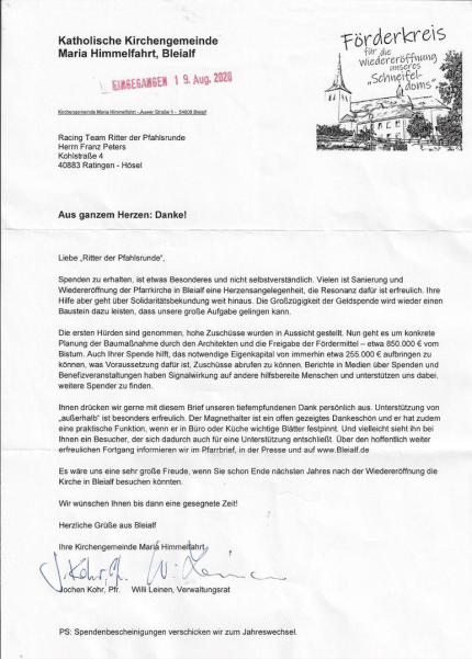 Wie wir ja schon berichtet haben, hat uns das Finanzamt eine Betriebsprüfung auferlegt. Der Aufwand war immens, kleinste Beträge wurden nachgeprüft. Vor allem aber ist die Art und Weise des Finanzamtes zumindest fragwürdig und nicht akzeptabel. Ganz klar ist es Ziel, Vereinen wie dem unseren, die Gemeinnützigkeit abzuerkennen und Steuerpflicht zu generieren. Das soziale Engagement, und ich erinnere hier nur an unsere Spende für die Restaurierung des Eifeldoms in Bleialf, die Zeitung berichtete ausführlich dazu, soll unterminiert werden. Verwerflich aber ist auch insbesondere die belehrende Art des Finanzamtes vor Prüfung und die grundsätzliche Unterstellung des nicht korrekten Verhaltens. Großer Dank gebührt unserem allerwertesten Steuerberater und Ritter Dr. Roland Schmidt. Sang und klanglos, wer hätte es auch anderes erwartet, hat dann unlängst das Finanzamt die Vorbehalte und Vorwürfe mit einem einzigen Satz im dann erteilten Steuerbescheid zurückgenommen und die Prüfung für erledigt erklärt. Wir haben es also dank präziser Dokumentation geschafft unsere Gemeinnützigkeit weiterhin zu erhalten.