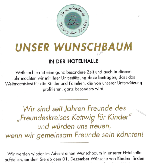 In diesem Jahr sind wir Paten der Wunschbaumaktion Schloss Hugenpoet in Zusammenwirklen mit dem Freundeskreis Kettwig für Kinder in Essen. Wir haben die Wunschzettel vom Wunschbaum gezupft und Tess und Marc sind losgezogen und haben für 10 Kinder die Geschenke eingekauft und stilvoll verpackt. An dieser Stelle unseren Dank an die Freunde und Mitglieder die sich mit einer Spende engagiert haben. Wir denken das ist eine gute Aktion und wird sicher bei den beschenkten Kindern, denen es vielleicht nicht so gut geht wie uns, viel Freude auslösen.
